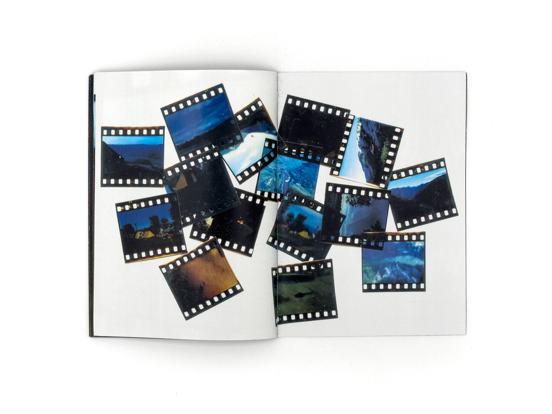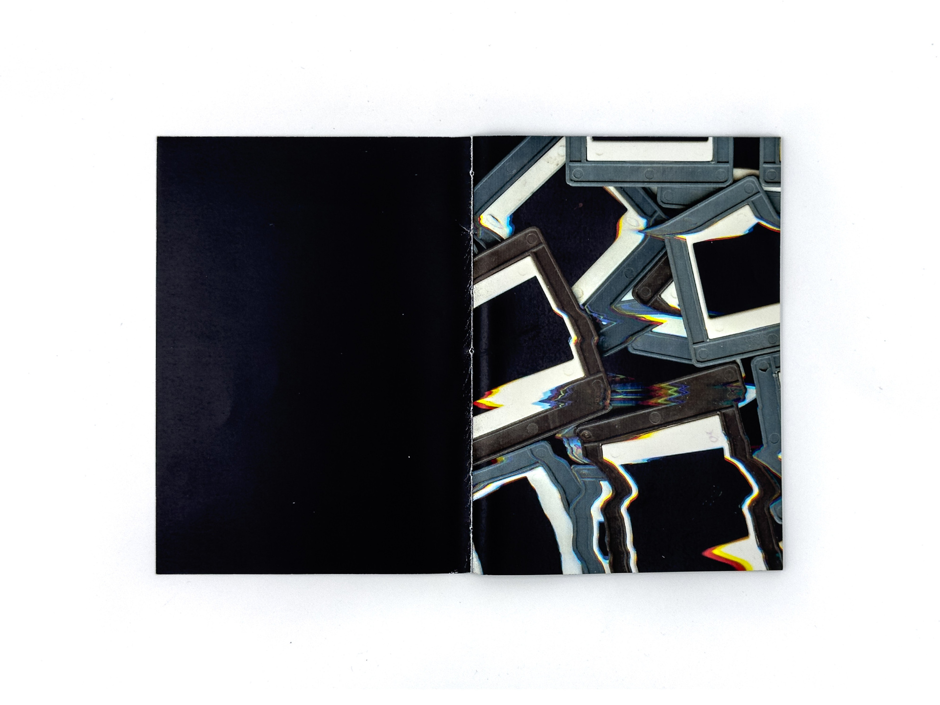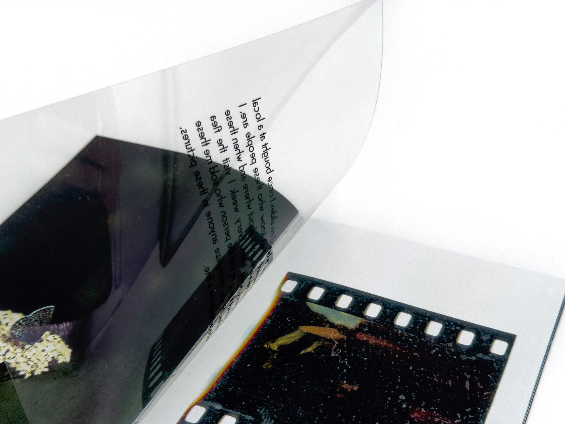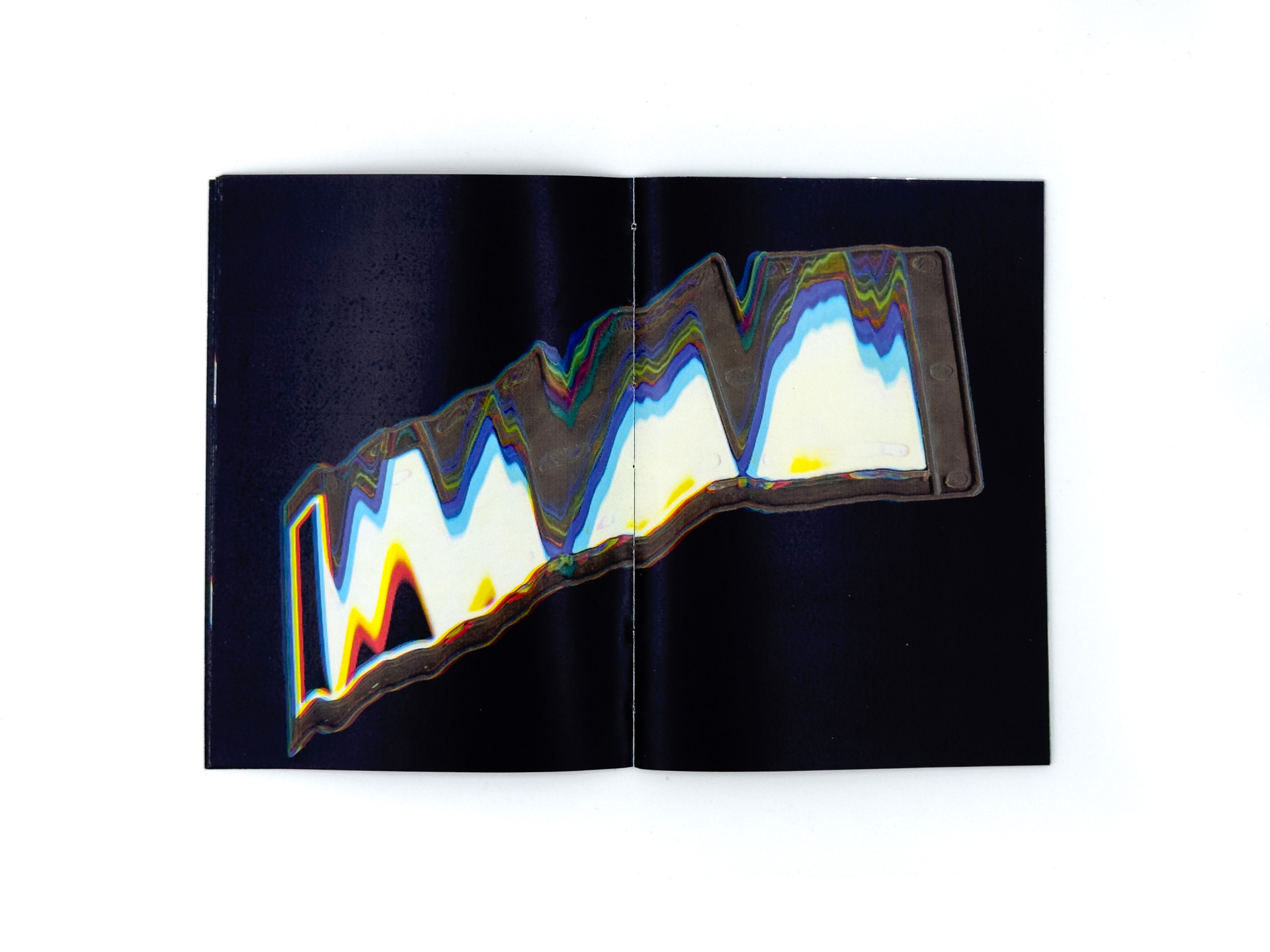 Я добавляю к слайдам новый визуальный слой — сканирую, размываю, превращаю в абстрактные изображения, напоминающие горные хребты. Сканография разрушает документальный статус фотографии и высвечивает её неопределённость. В зине это различие становится осязаемым: снаружи — плотная глянцевая бумага со сканографиями, внутри — тонкая хрупкая бумага с архивными снимками, а между ними прозрачная плёнка, требующая взгляда «сквозь», словно на диапозитив.