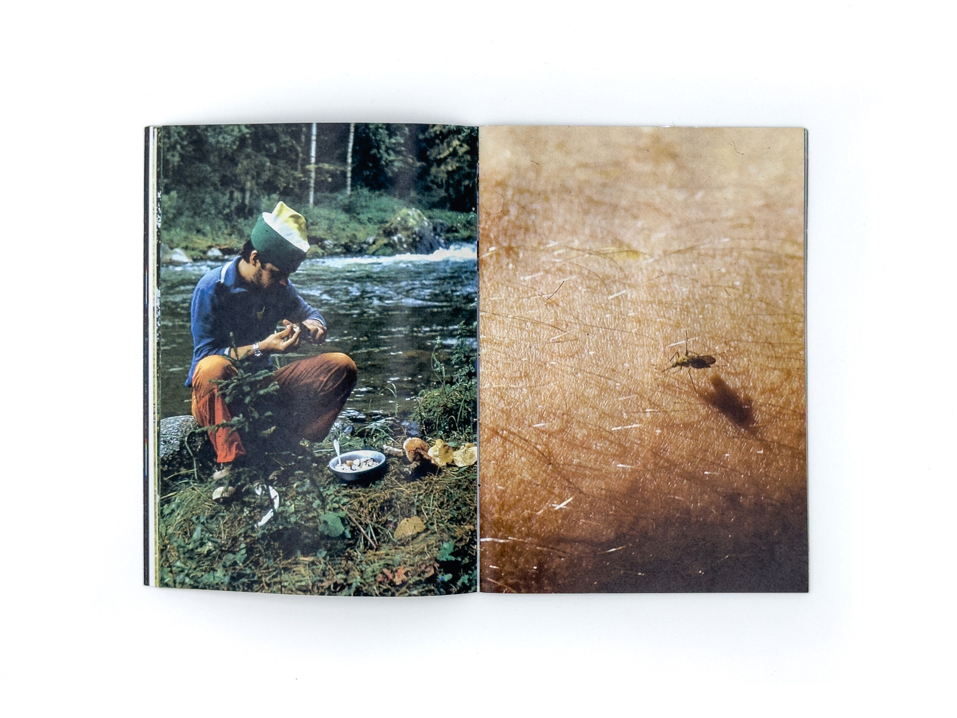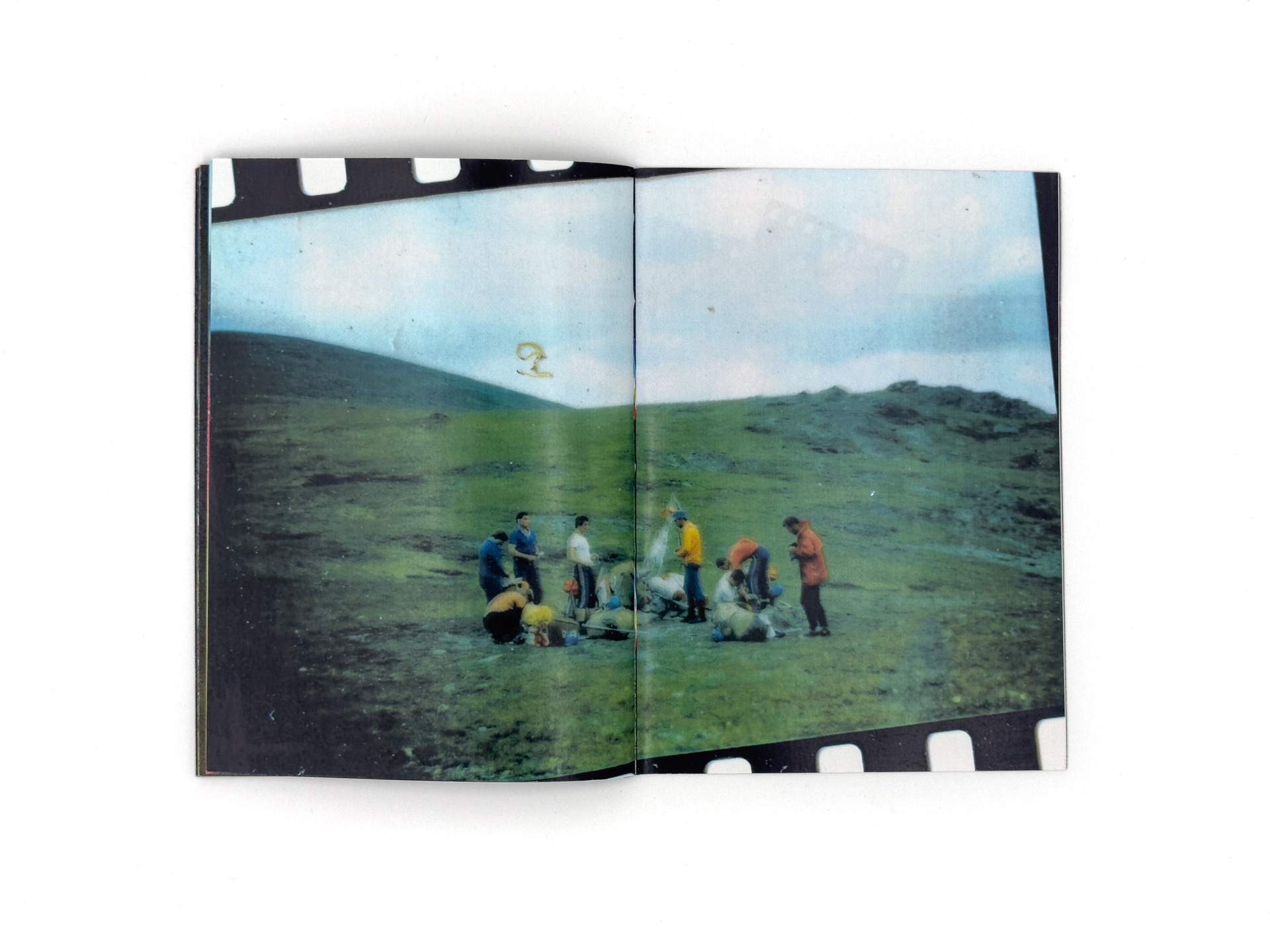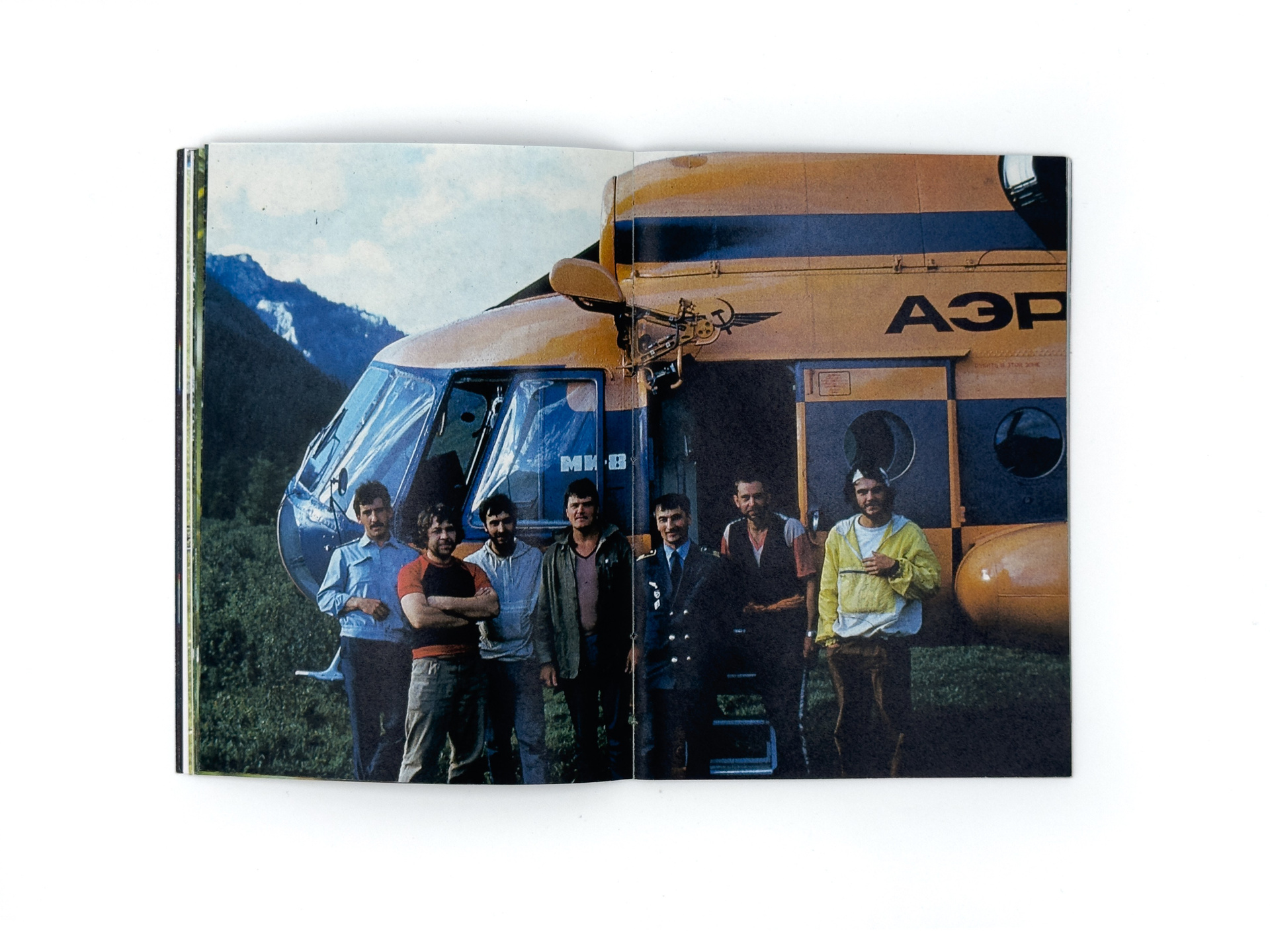 Серия «Flight Mode» началась с находки на блошином рынке: коробки со старыми слайдами. На них — мужчины, возможно геологи, в безымянных горах. Они живут в палатках, собирают грибы, разводят костры, фотографируют насекомых и радугу, летают на вертолётах и с улыбкой позируют перед камерой. Эти кадры сохраняют чужую жизнь, но одновременно ускользают от расшифровки: лишённые дат и имён, они превращаются в безымянный ландшафт памяти.