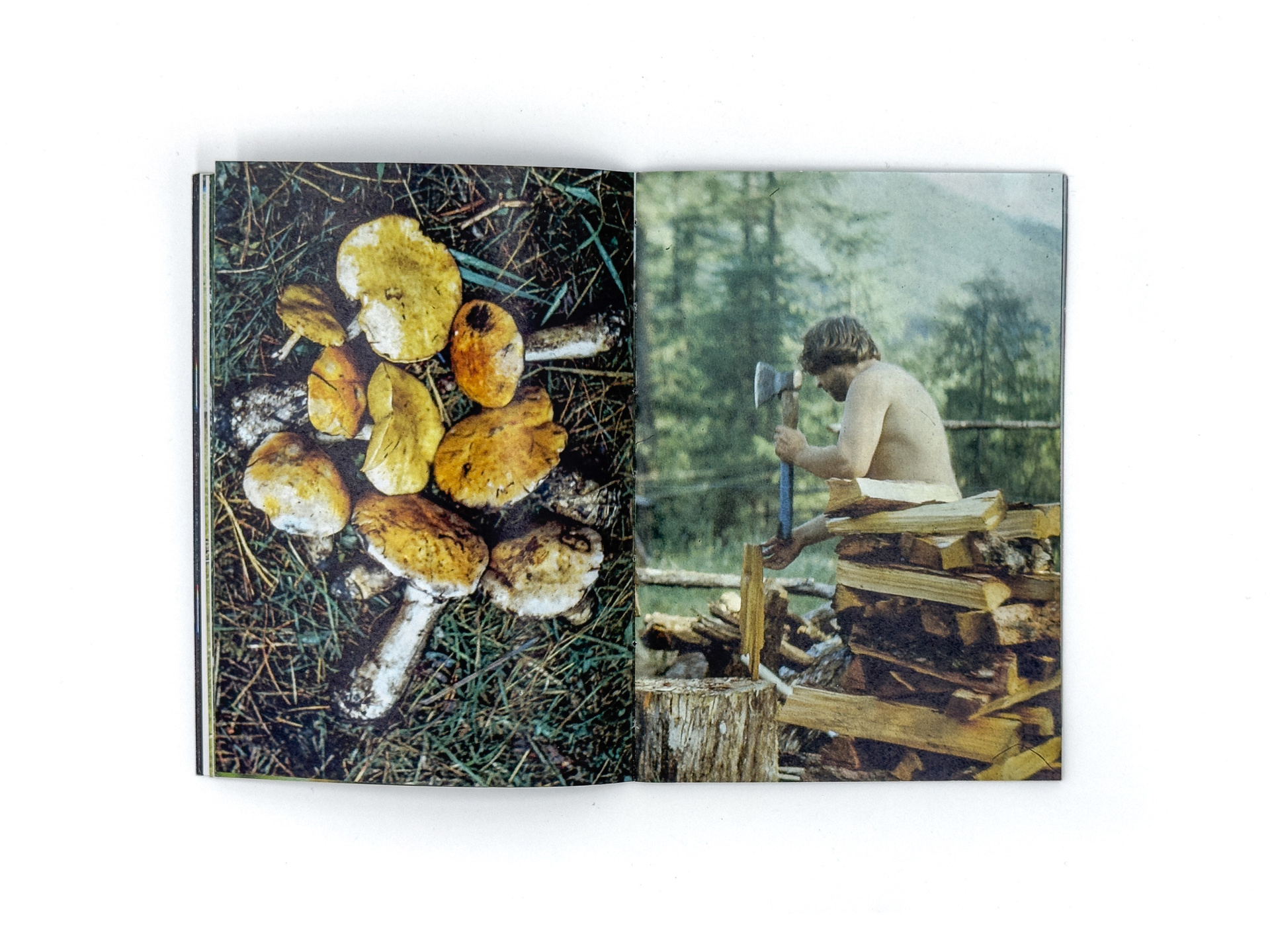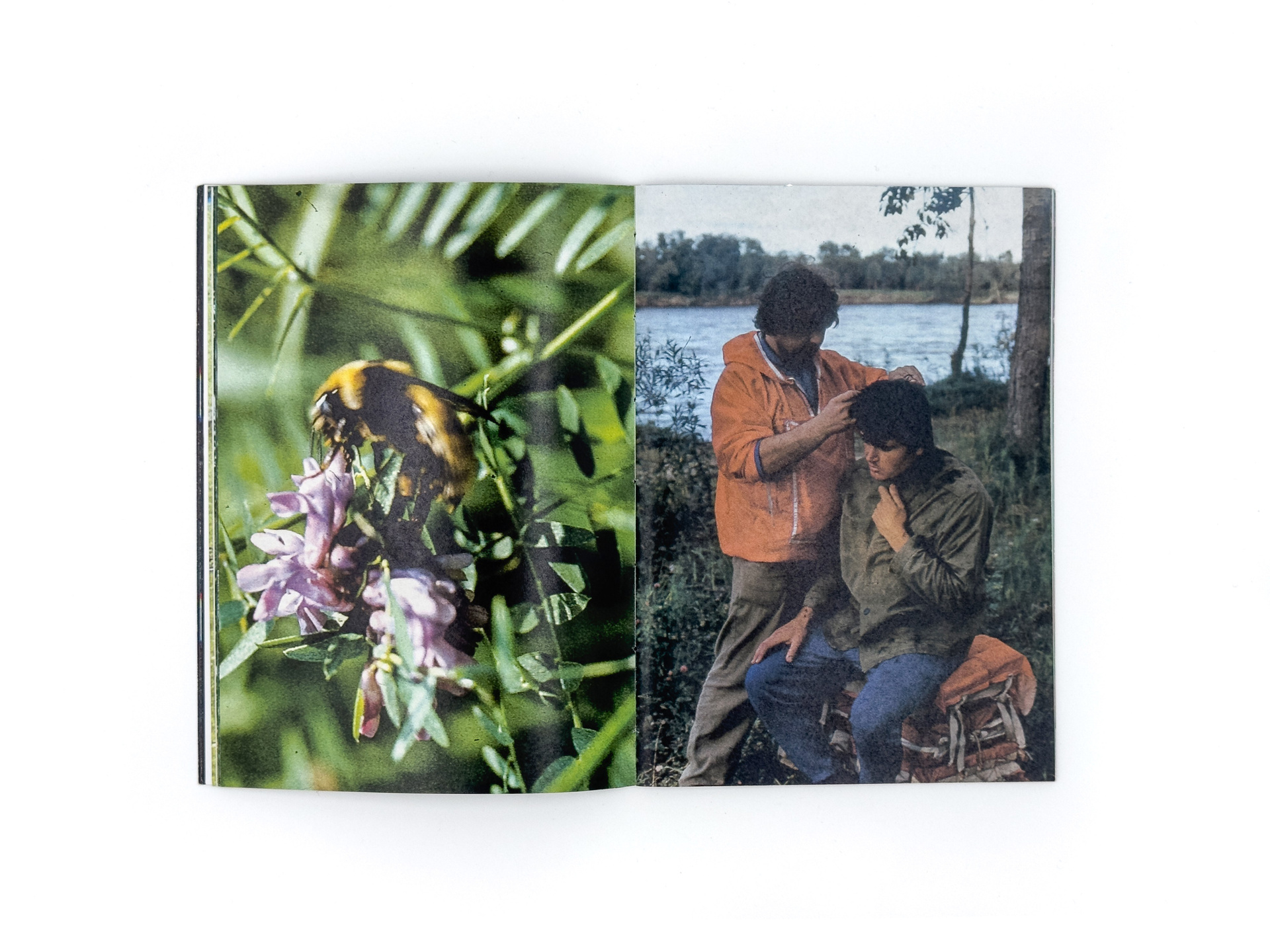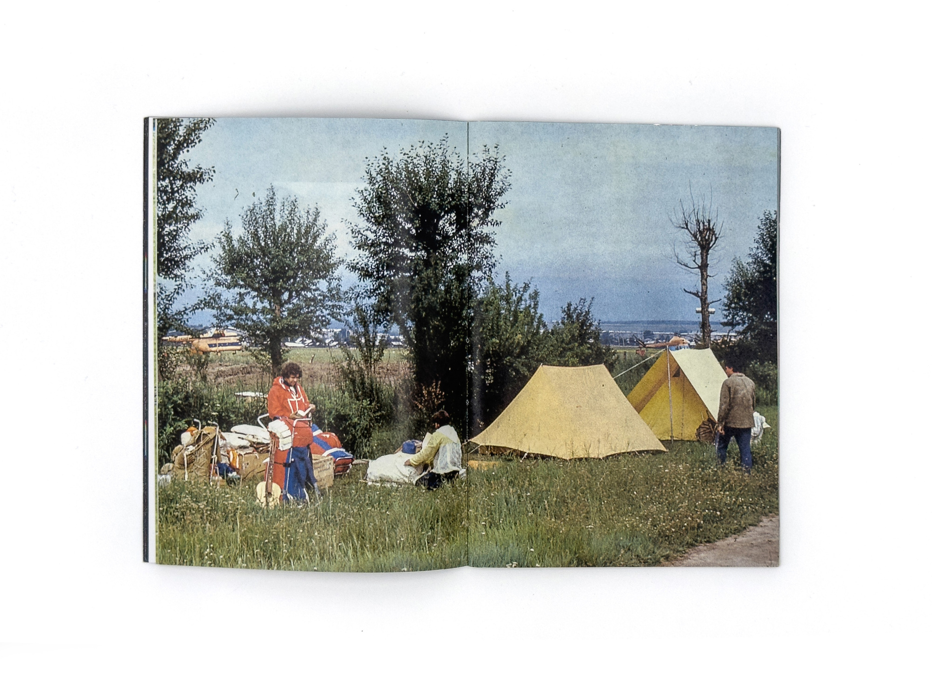 Серия «Flight Mode» началась с находки на блошином рынке: коробки со старыми слайдами. На них — мужчины, возможно геологи, в безымянных горах. Они живут в палатках, собирают грибы, разводят костры, фотографируют насекомых и радугу, летают на вертолётах и с улыбкой позируют перед камерой. Эти кадры сохраняют чужую жизнь, но одновременно ускользают от расшифровки: лишённые дат и имён, они превращаются в безымянный ландшафт памяти.