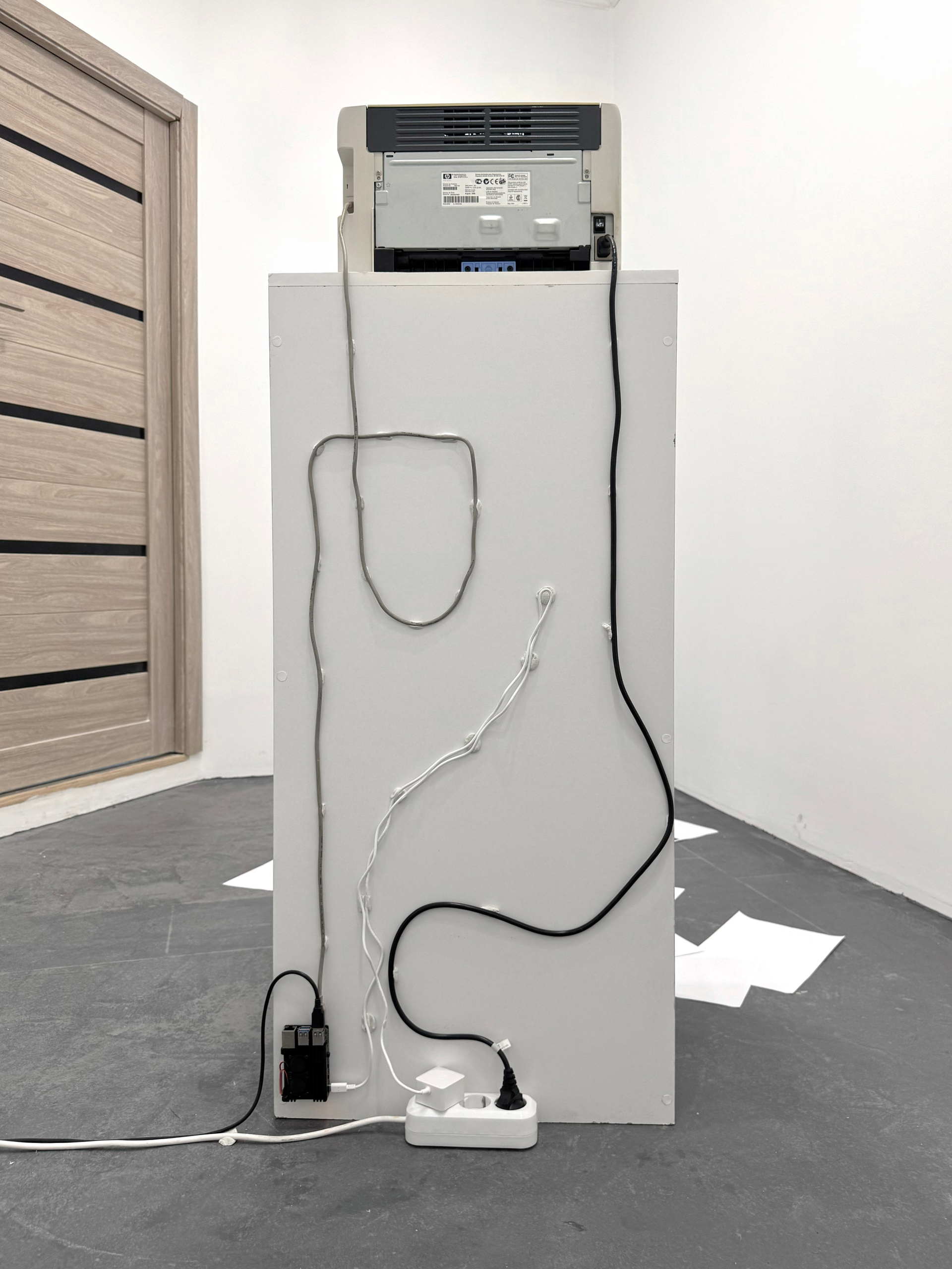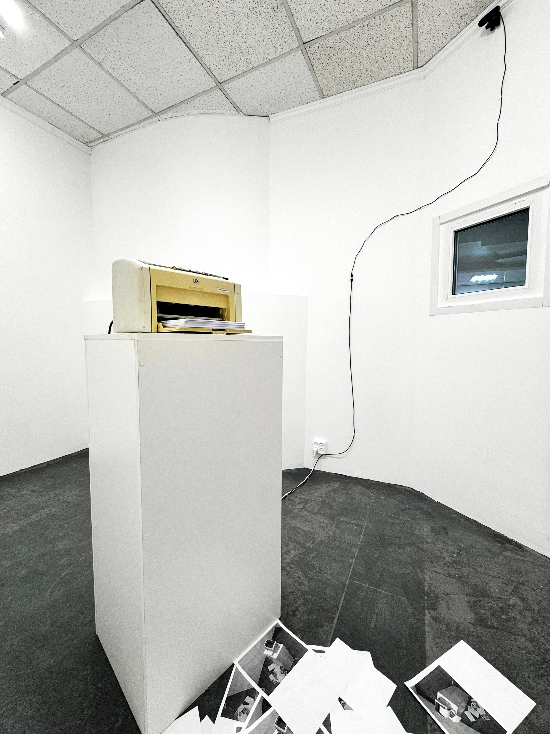 Мы рассматриваем эту работу как исследование внимания и контроля. В зале установлена камера, направленная на принтер. Каждые 15 минут принтер воспроизводит изображение с камеры: на снимке — сам принтер, окно и часть пола вокруг. Распечатанный лист падает вниз, постепенно формируя слой бумаги, в котором невозможно различить последовательность событий.