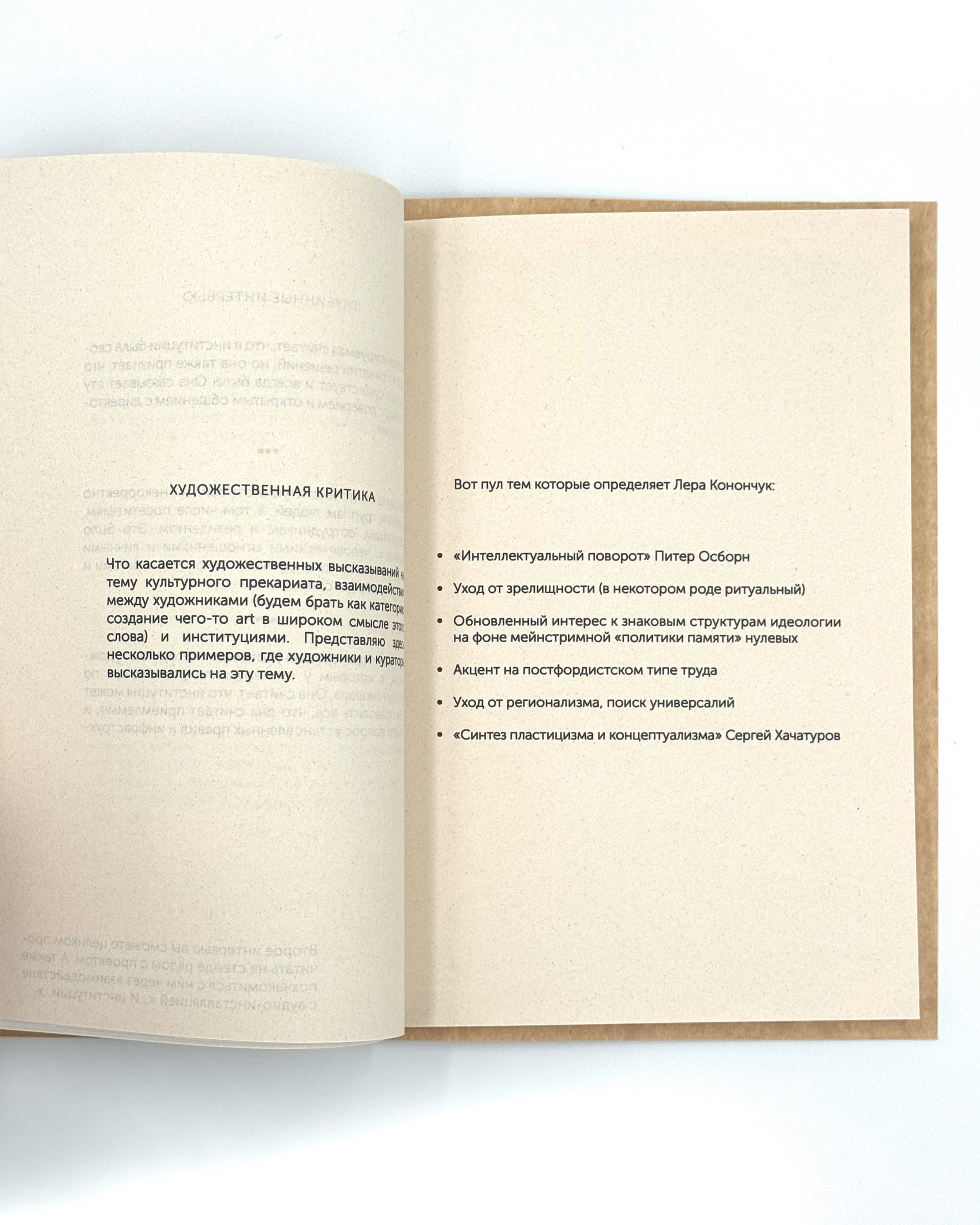 «Мне ещё кажется точкой схождения в наших проектах выступает напряжение субъективного опыта и объектив- ного знания, выявление верифицируемой информации, которая как бы присутствует спекулятивно сама по себе. Так например в работах некоторых художников опорной осью является их место рождения, их интерес обусловлен город- ской идентичностью, но само поле исследования собира- ется из внешних этой идентичности данных (не связанных с личным опытом) Есть сходство с парадоксом доисториче- ского, который описан в После конечности Мейясу, только в нашем случае проблематизируется не мышление и бытие, а соотношение субъекта, формирование идентичности через объекты не наблюдения. Что-то, что я не видел, является частью меня».